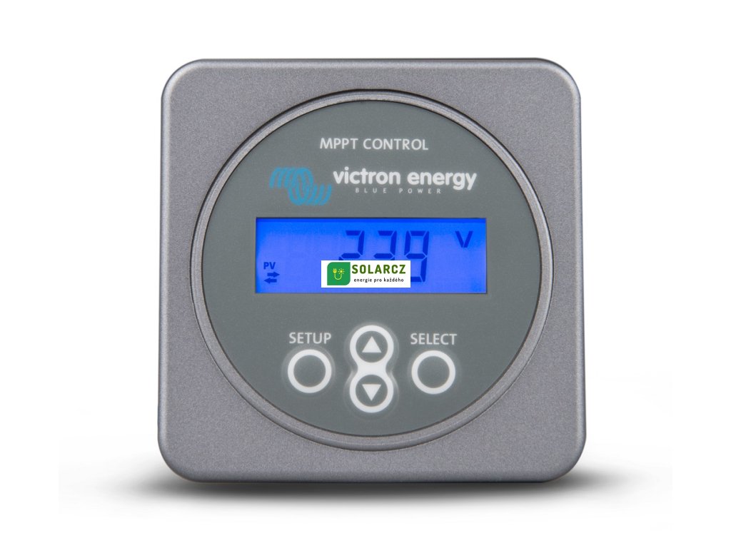 Modře podsvětlený digitální displej k Victron BlueSolar MPPT regulátorům pro sledování aktuálních provozních hodnot, zobrazování historie a nastavování provozních parametrů regulátorů. Je určen pro všechny Victron BlueSolar MPPT regulátory s VE.Direct protokolem se čtyřpinovým portem s výjimkou staršího modelu MPPT 70/15 (již se nevyrábí). Displej není určen pro velké Victron BlueSolar MPPT regulátory 150/70 a 150/85 (jiný komunikační protokol, displej součástí regulátoru).