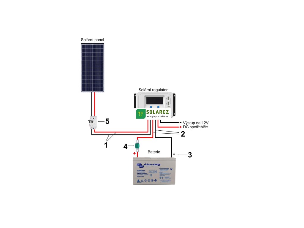 Sada neobsahuje propojovací kabeláž pro připojení panelu, regulátoru a baterie ani svorky pro připojení k akumulátoru. Tyto komponenty jsou nutné pro kompletní instalaci systému.