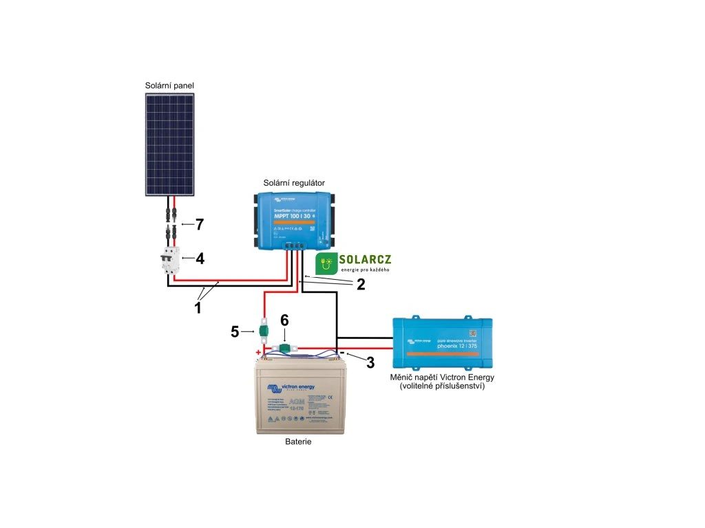 Set solárního systému neobsahuje propojovací kabeláž pro připojení regulátoru k panelu a baterii a svorky či oka pro připojení k akumulátoru, což jsou komponenty nutné pro funkční kompletaci systému. Pokud budete mít zájem o tyto komponenty, na základě délky kabelů doporučíme jeho vhodný průřez a případně další komponenty. Použitím dostatečného průřezu zabráníme možným zbytečným ztrátám, které vznikají díky vysokým proudům v systému.